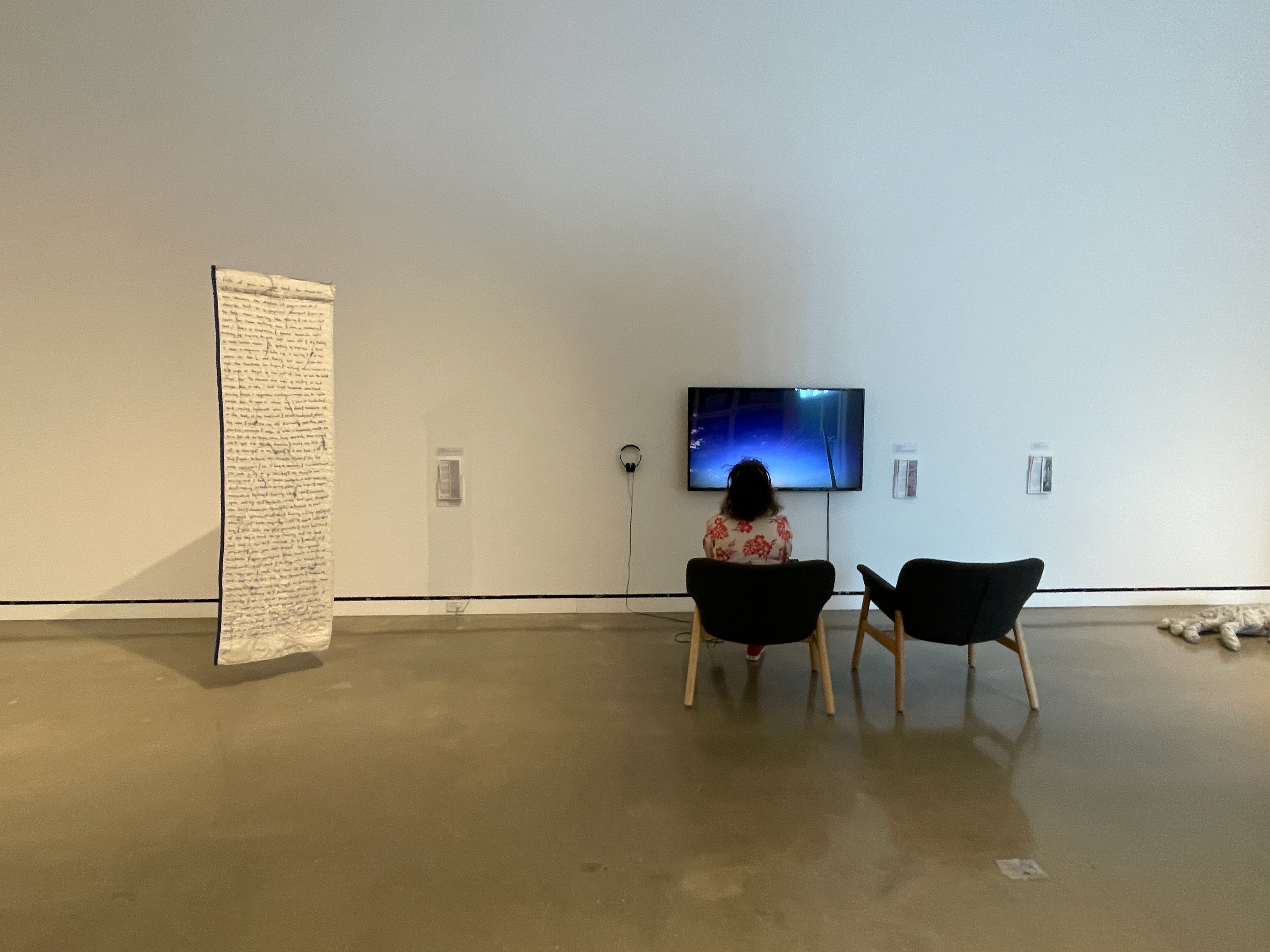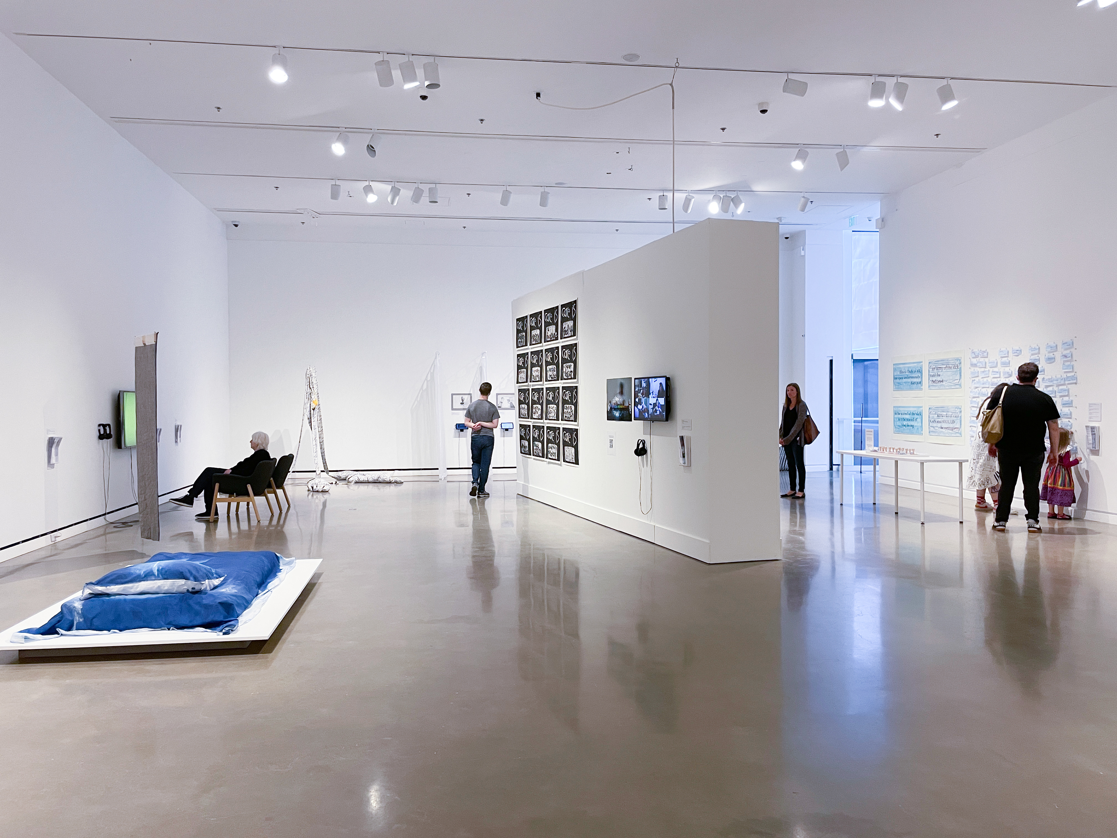 I turned toward artists, authors and advocates that traced these uncharted paths for themselves and for others. Most are BIPOC, trans, queer, or immigrants who created revolutions from their bed through their written words, visual art and conversations. To honor those mentors and with the hope that visitors will find guidance, clarity and resonance, a list of inspirations is included at the end of this statement. Similarly, to overcome the idea that illness is confined to the invisible and lonely, it was important to make a space for rest and reflection within the gallery. In the Care Library, visitors can pause, ground themselves, and browse a multimedia selection of resources including books, podcasts, essays and more.